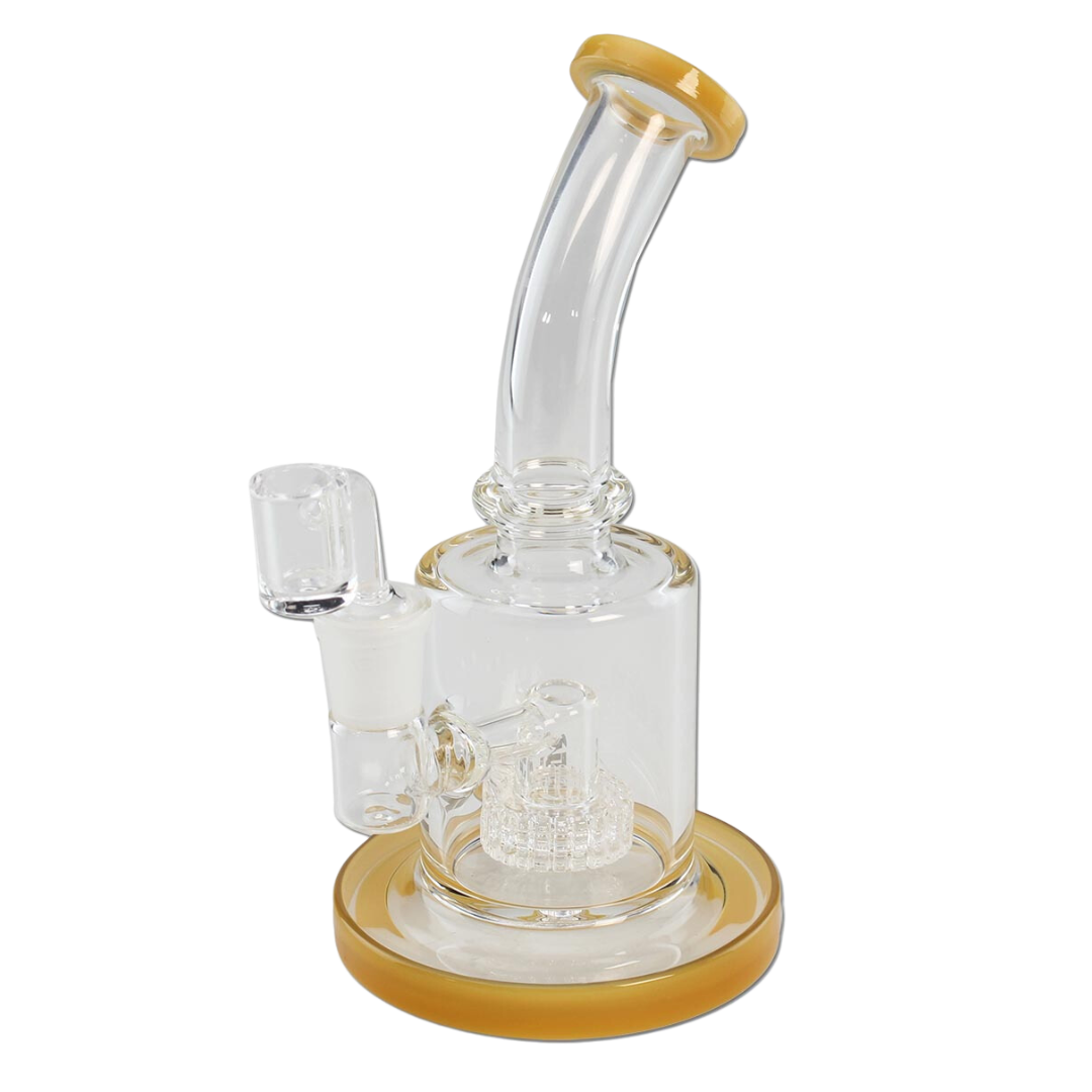 Stabil lille dab rig, håndlavet af borosilikatglas med det sølvskinnende BLAZE GLASS®-logo og tromleperkolator med en hel del slidser til den kølende bobleeffekt! Med 4 mm vægtykkelse, mælkemoccafarvede glasdele, alt dette gør den til en virkelig lækker rig at have stående!