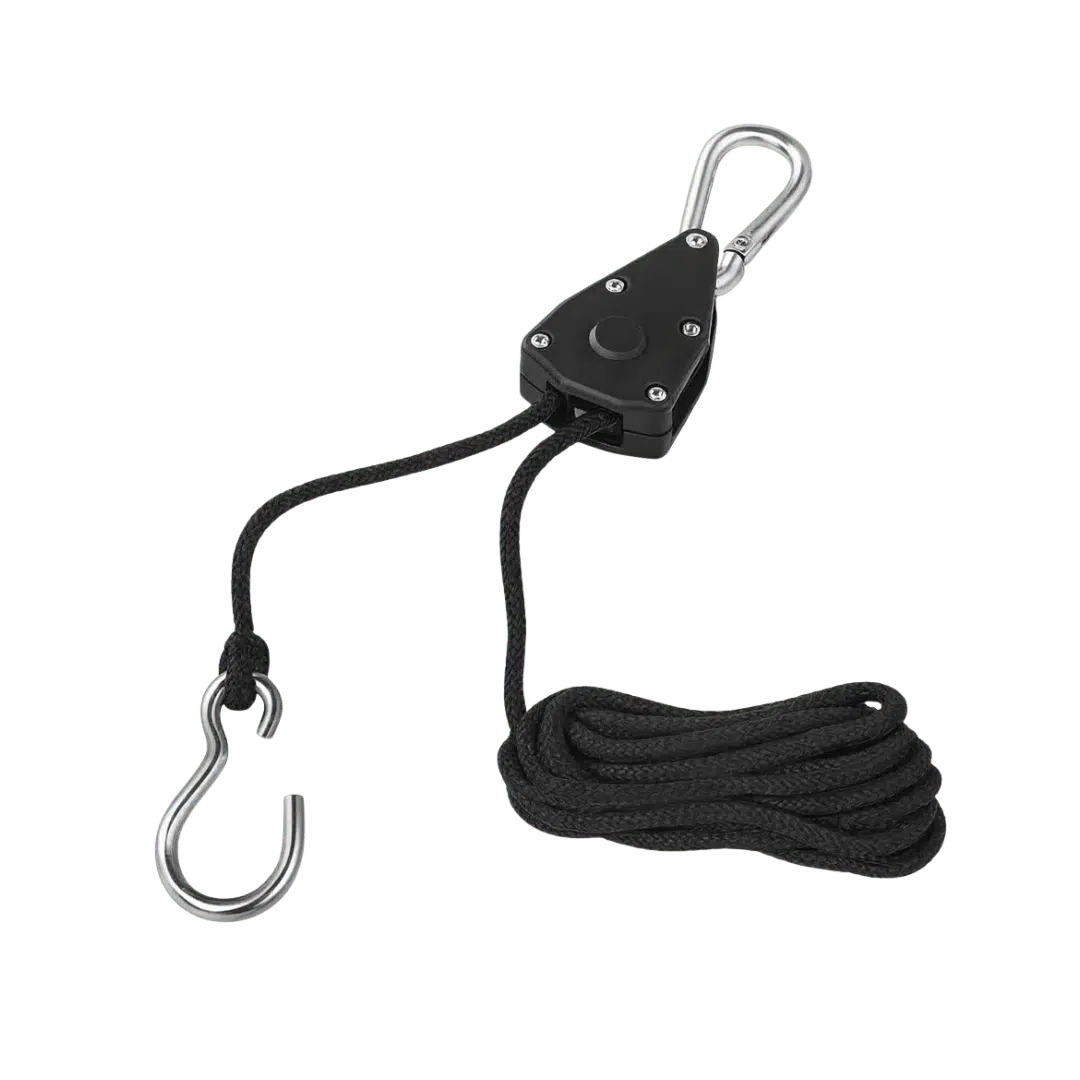 Denne rope ratchet er et solidt og fleksibelt ophæng til din grow opsætning. Ratchet-mekanismen gør det nemt at justere højden på lamper og udstyr, mens kombinationen af karabinhage i toppen og metal-krog i bunden giver en hurtig, sikker og praktisk montering.