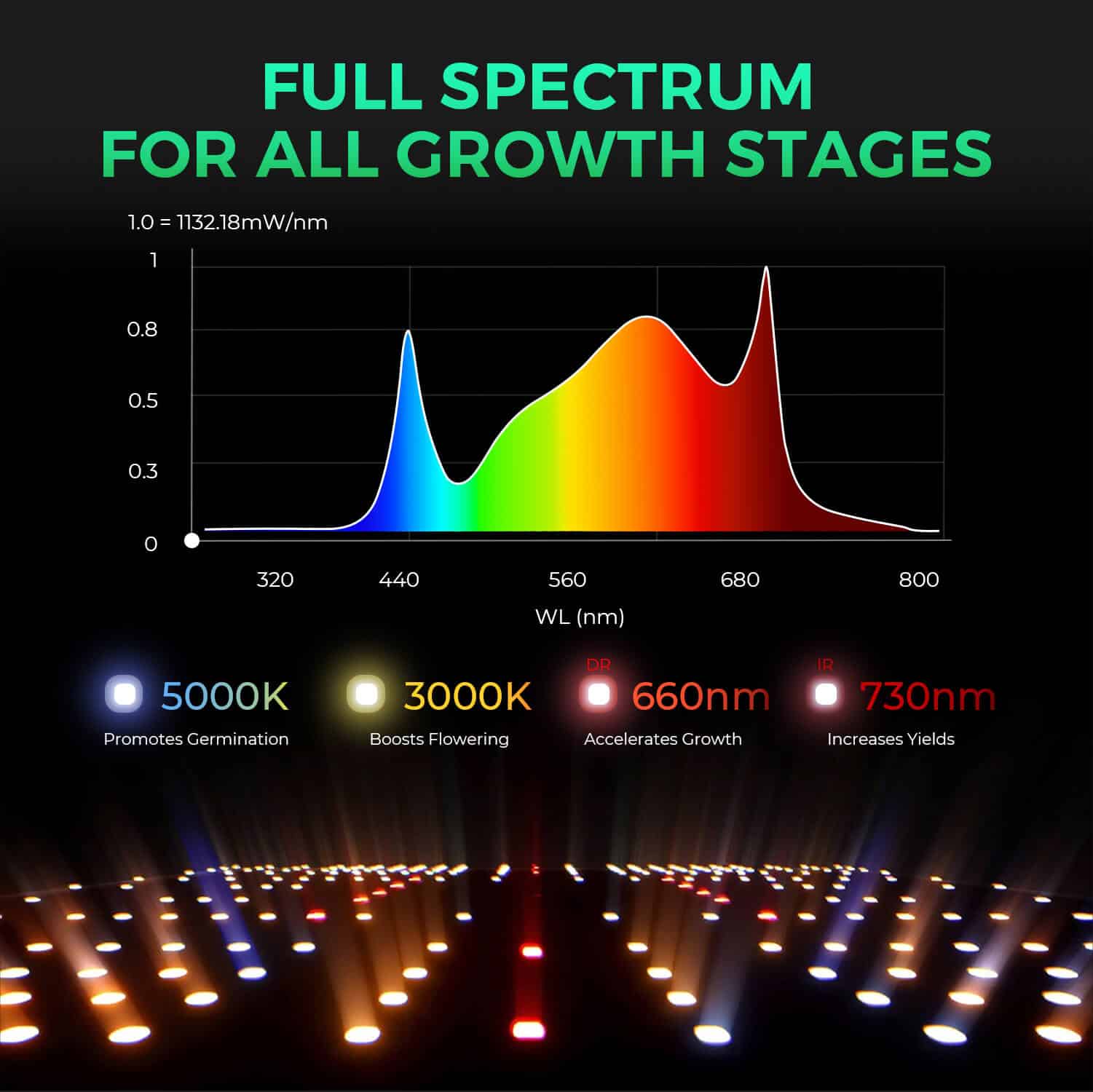 Med det avancerede spektrum kombinerer SP3000 Greenhouse både rød, blå og fuldspektrum LED’er, så planter får det optimale lys til alle faser af væksten. Det forbedrede design sikrer højere PPFD og stærkere penetration gennem bladene.