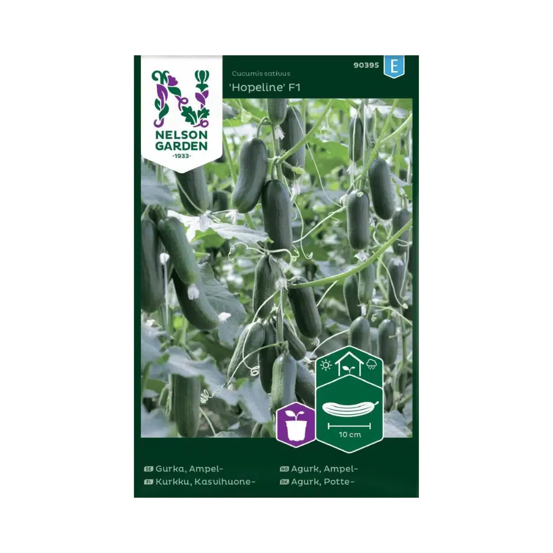 Hopeline F1 er en asiatisk-inspireret miniagurk, der skiller sig ud med sit lidt tørrere, faste frugtkød og en mere koncentreret smag end mange andre agurker. Frugterne holdes små (ca. 8–10 cm), hvilket gør dem særligt velegnede som snackagurker, i salater eller til tapas — især når de høstes løbende. Planten kræver ikke bestøvning, hvilket gør dyrkningen enkel og pålidelig, også i potter, ampel eller drivhus. Den klatrer eller hænger let og passer godt til begrænsede dyrkningsforhold. Sådybden er ca. 2 cm, planteafstanden ca. 50 cm og rækkeafstanden ca. 75 cm; forkultur anbefales i april–maj, og høstperioden ligger typisk i juli–september. Ved korrekt dyrkning i varm, solrig jord og med regelmæssig høst får du en god høst med små, sprøde agurker gennem sommeren.