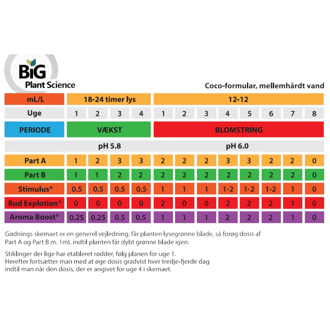 Ved at følge “Big Plant Science Coco” gødningsplanen kan du opnå en sund og kraftig plantevækst, samtidig med at du undgår over- eller undergødning. Denne gødningsplan er baseret på videnskabelige principper og testet i praksis for at sikre, at den giver de bedste resultater.