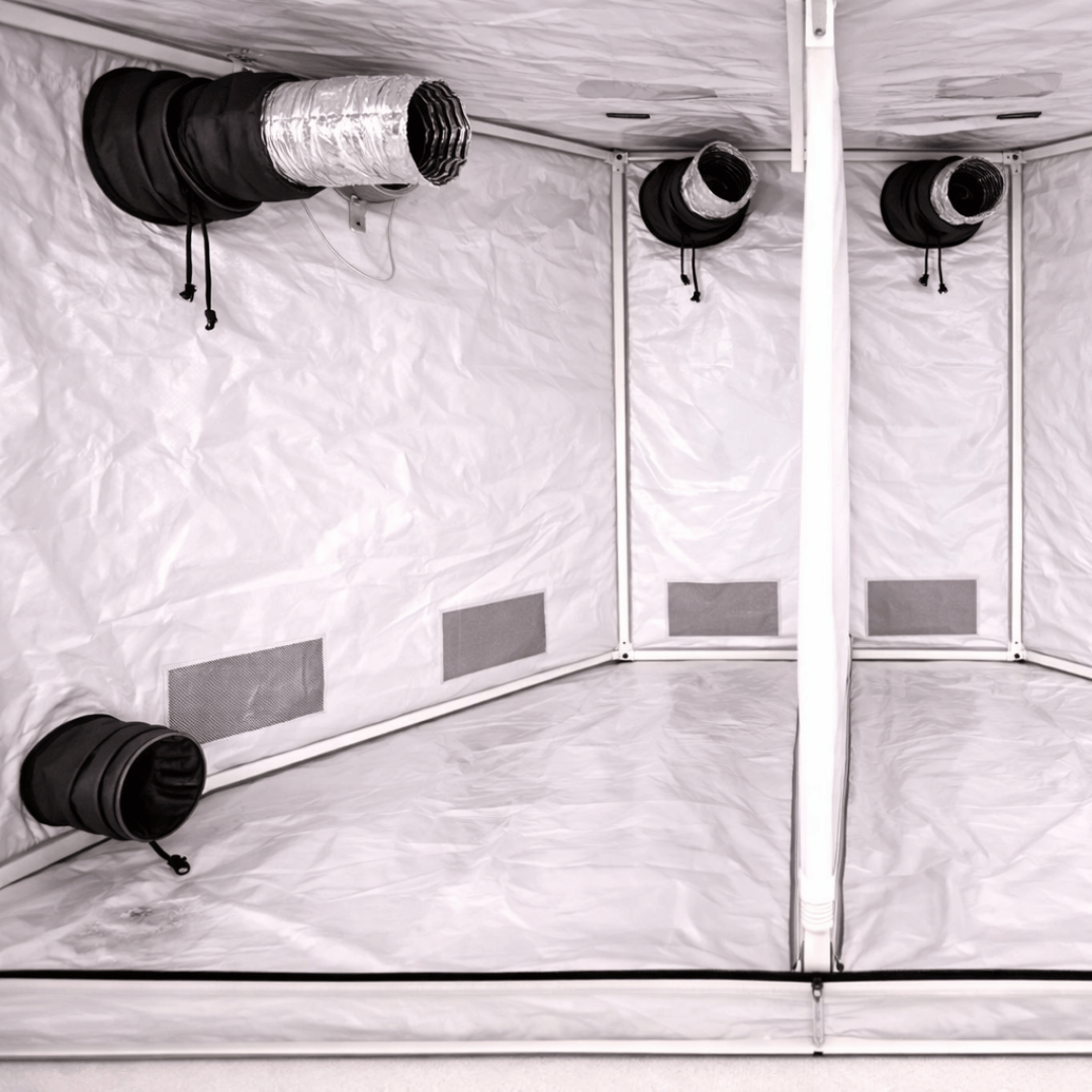 Teltet er fremstillet i kraftigt 600D materiale med hvid reflektiv inderside, som sikrer jævn lysfordeling og optimal udnyttelse af dit grow-lys. Den solide ramme med 19 mm malede metalstænger giver stabilitet og gør det muligt at montere tungt udstyr som lamper, filtre og ventilationssystemer.